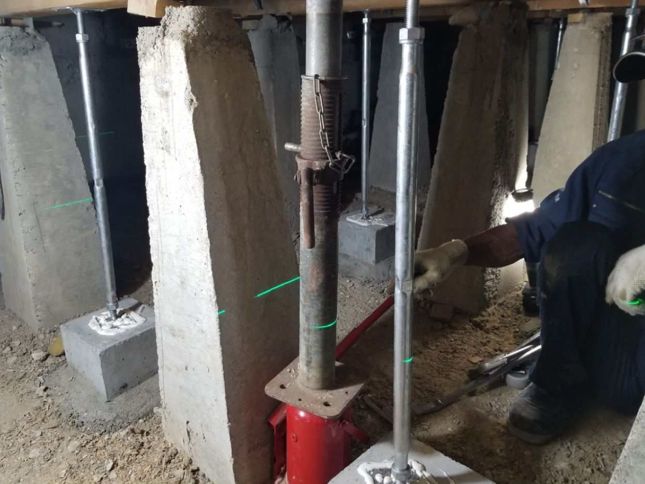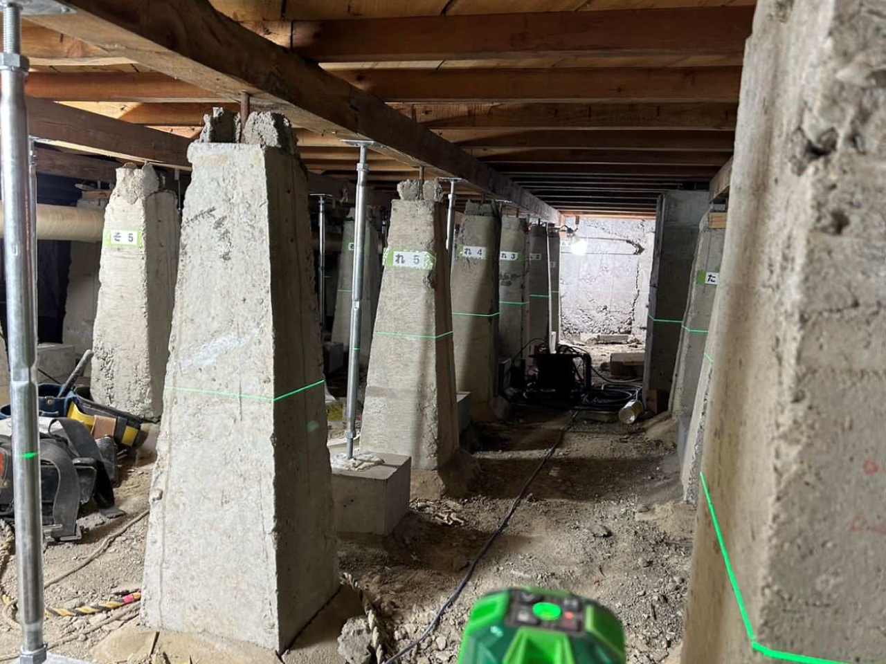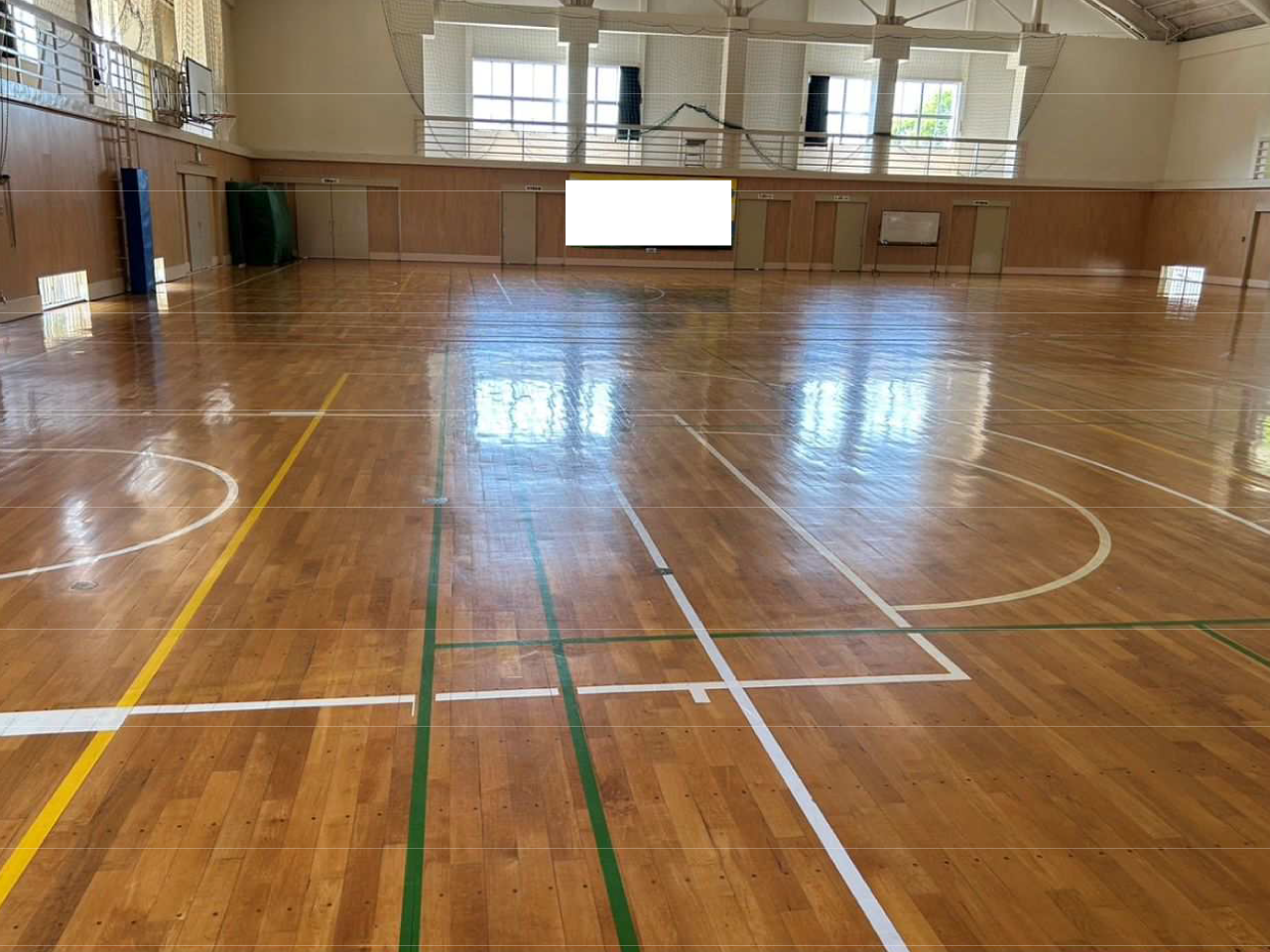 体育館床の不陸高さ、床・ジャッキアップ調整作業をしております。