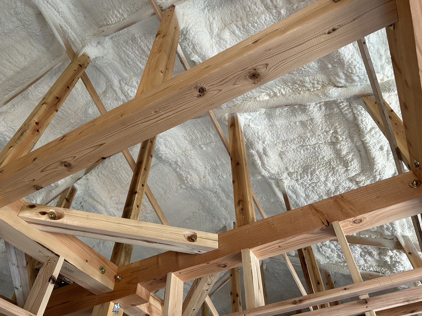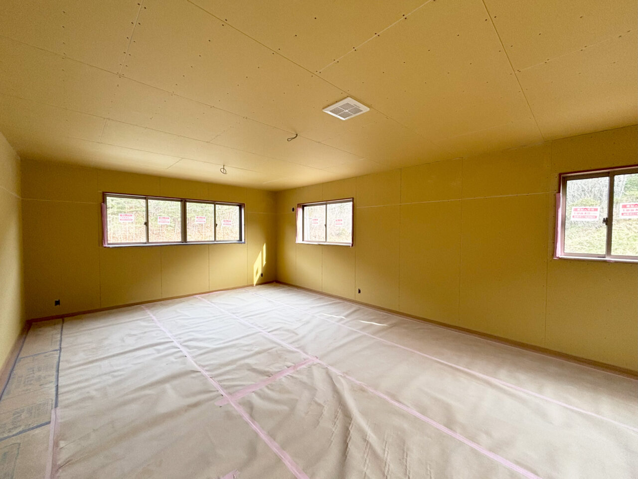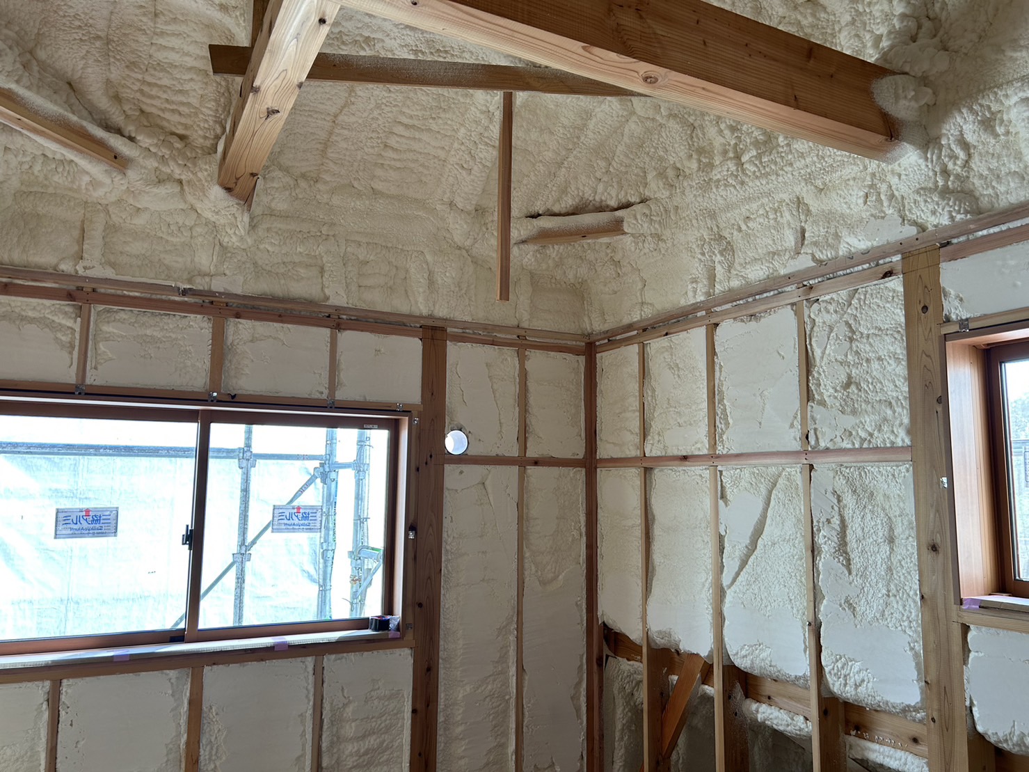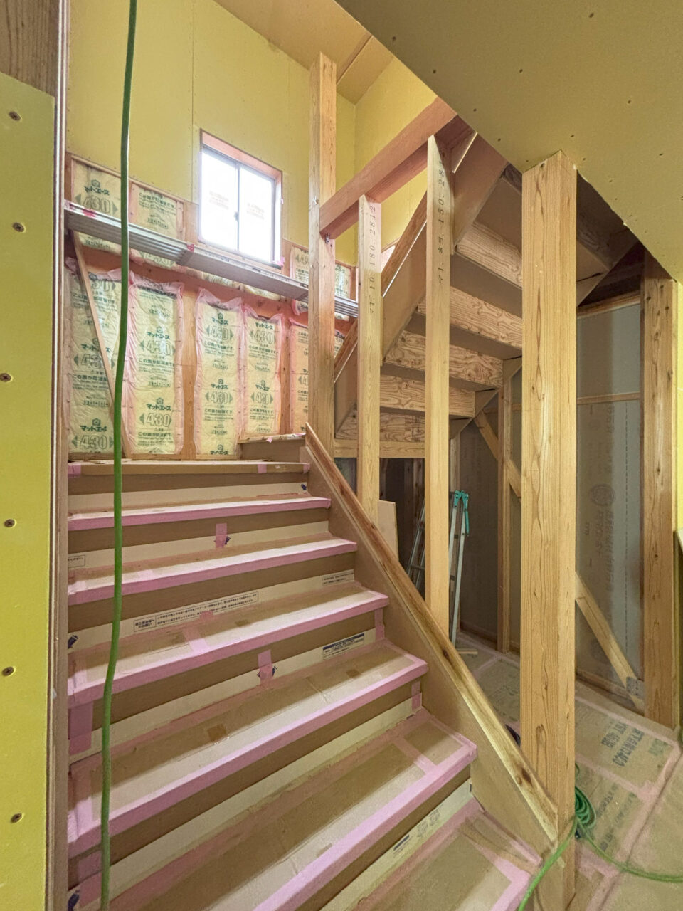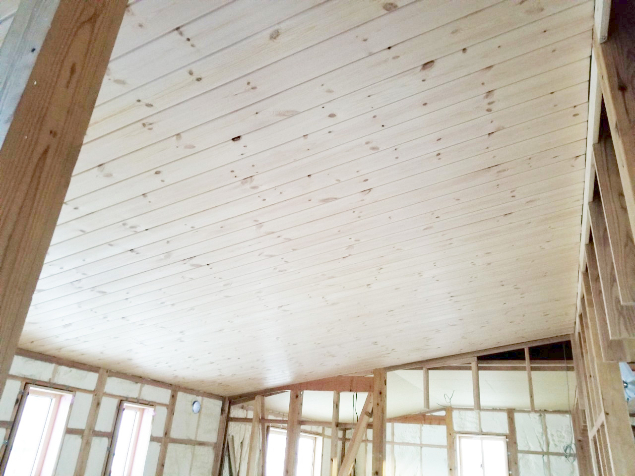 リビングの吹き抜け天井は、松無垢板仕上げです。